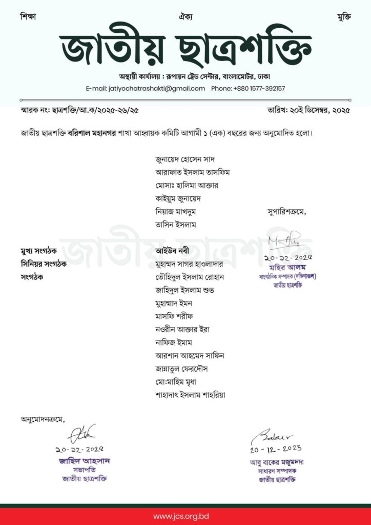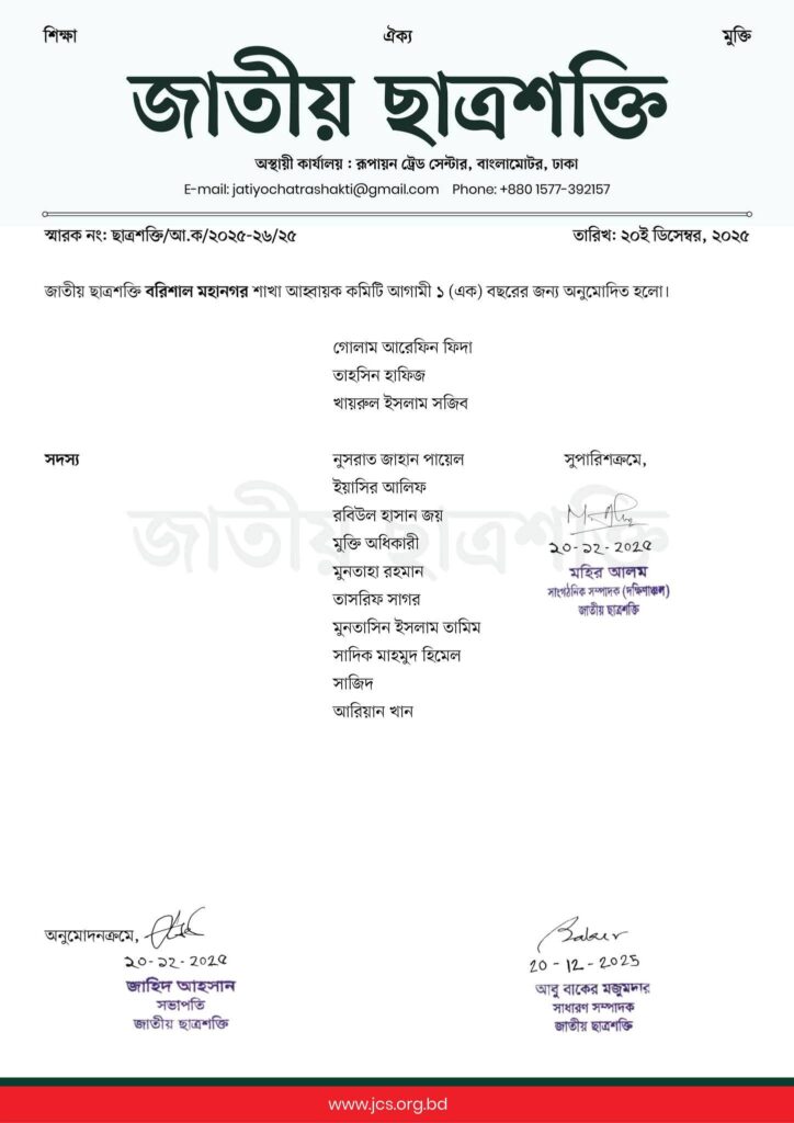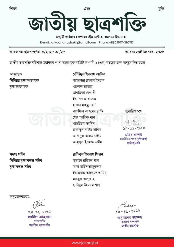 জাতীয় ছাত্রশক্তি বরিশাল মহানগর শাখার আহ্বায়ক কমিটি ঘোষণা: তৌহিদুল ইসলাম আকিব আহ্বায়ক, রাকিবুল ইসলাম সিহাব সদস্য সচিব